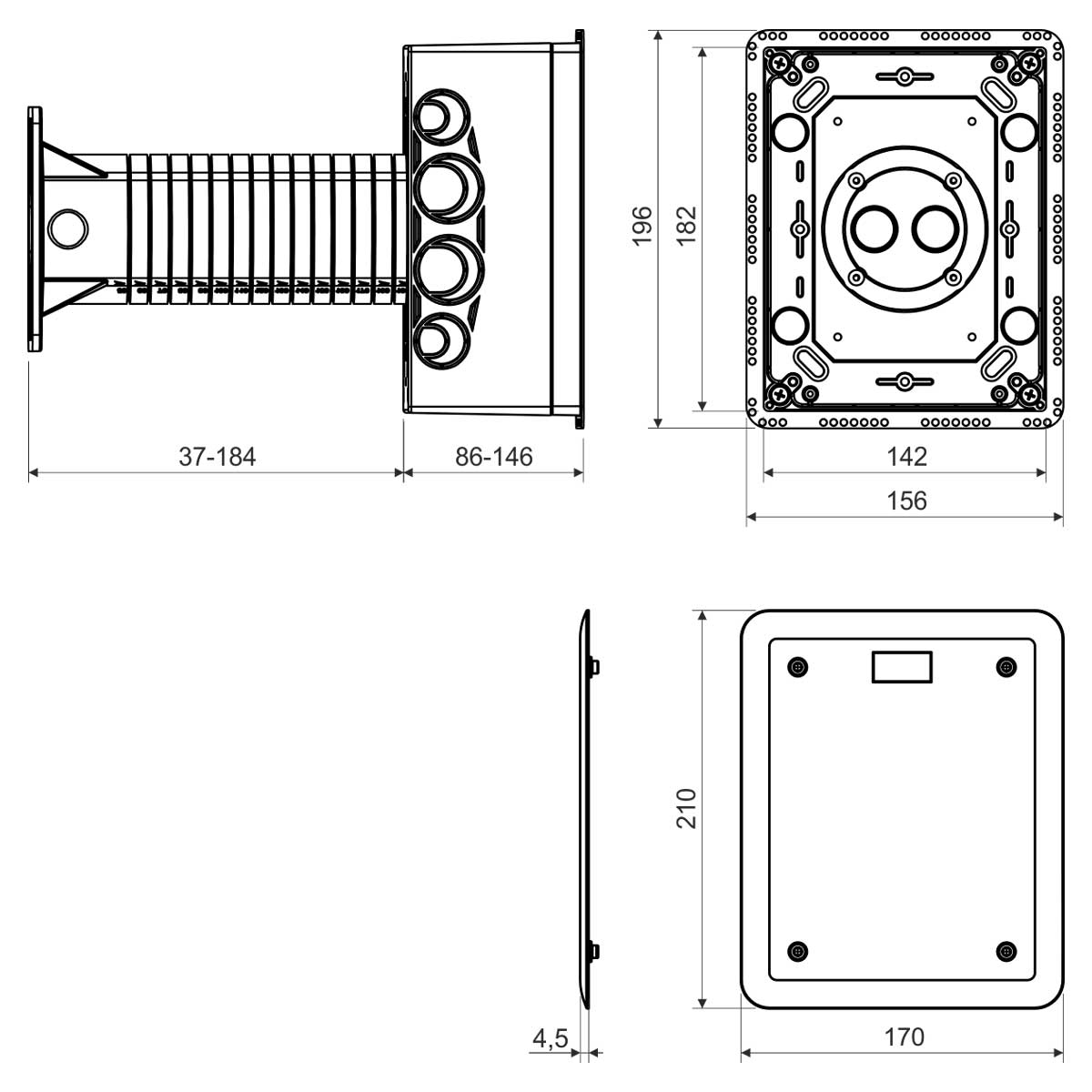Для установки устройств в утепленные фасады зданий толщиной 120 - 330 мм. Использование в качестве распределительной коробки, для измерительного вывода молниеотвода и других применений по желанию заказчика. Исключает образование тепловых мостов. Регулируемая глубина ящика. В комплект входят коробка, трубка, внешняя и внутренняя изоляция, монтажный комплект, плоская крышка и винты из нержавеющей стали + прокладка. Прочная конструкция. Охраняется европейским промышленным и полезным образцом.